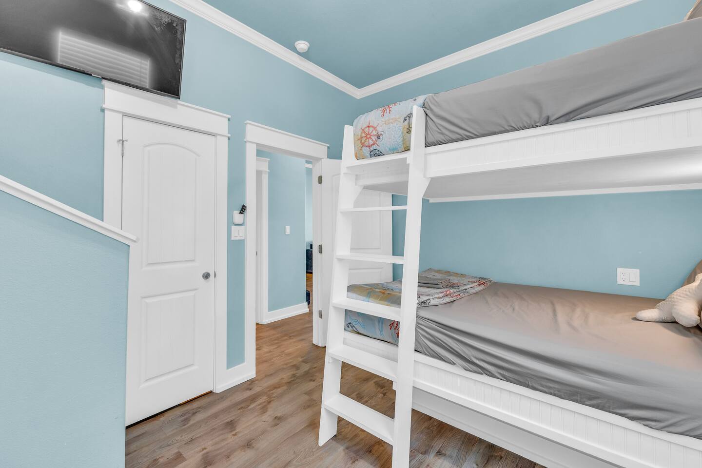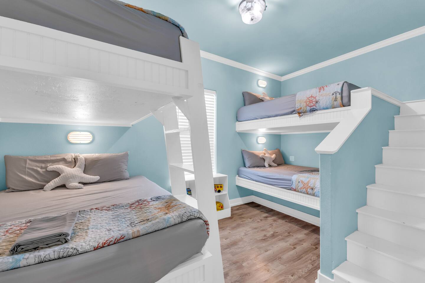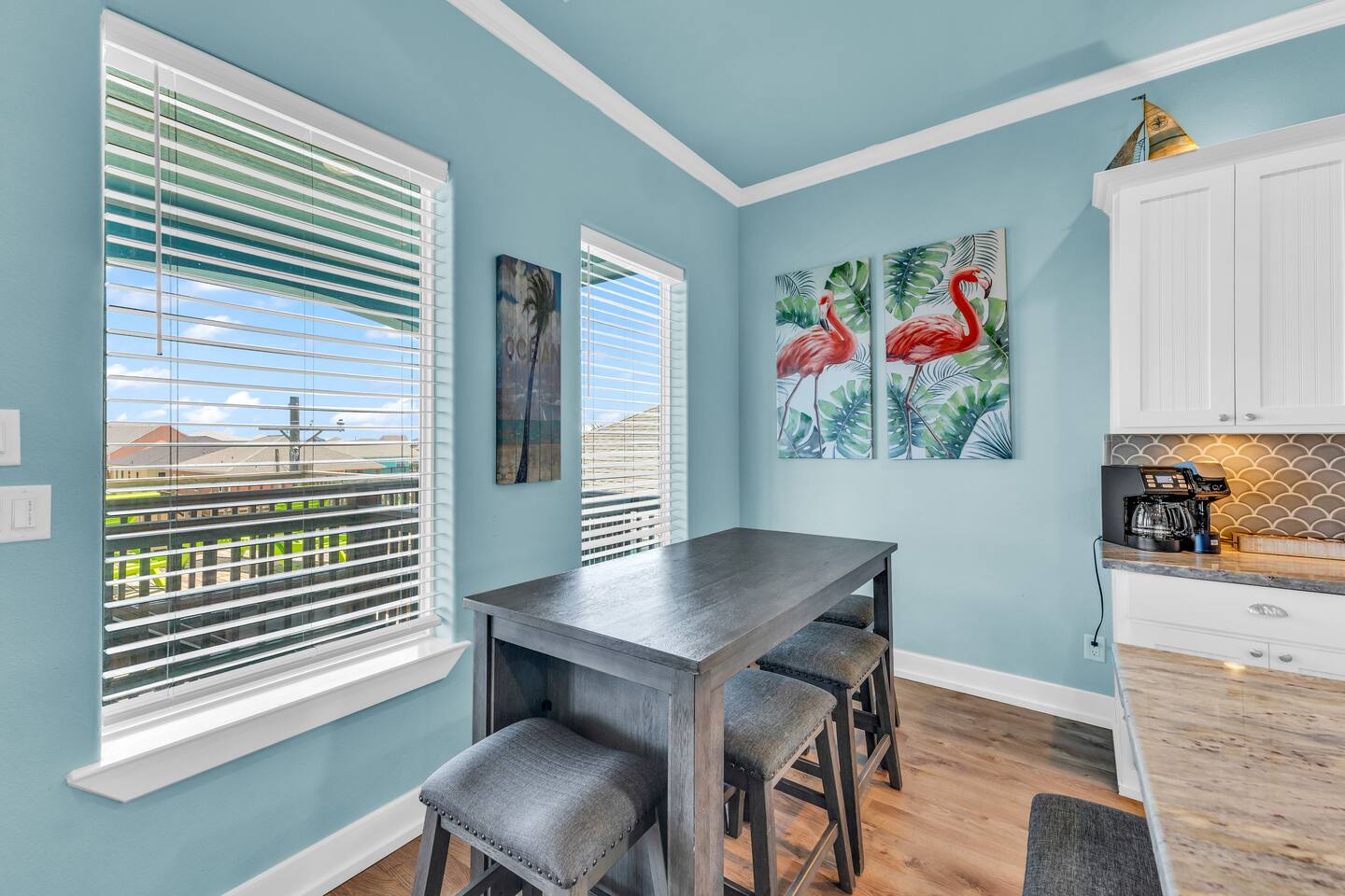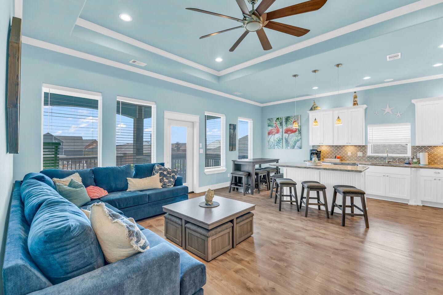MEET ME ON THE MEZZ – welcome to the Mezzanine at Crystal Beach, where you can enjoy 3 levels of paradise. This family-friendly retreat is the perfect gathering space for your next beach getaway. A 3-minute walk is all that separates you from the sand. You’ll love the Mezzanine level bar, king suite, and kitchen with garage-door access to the outside. The top level welcomes everyone in your party with a family-friendly bunk room, king owner’s suite, and queen bedroom with workstation.