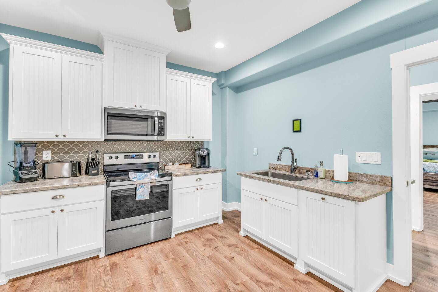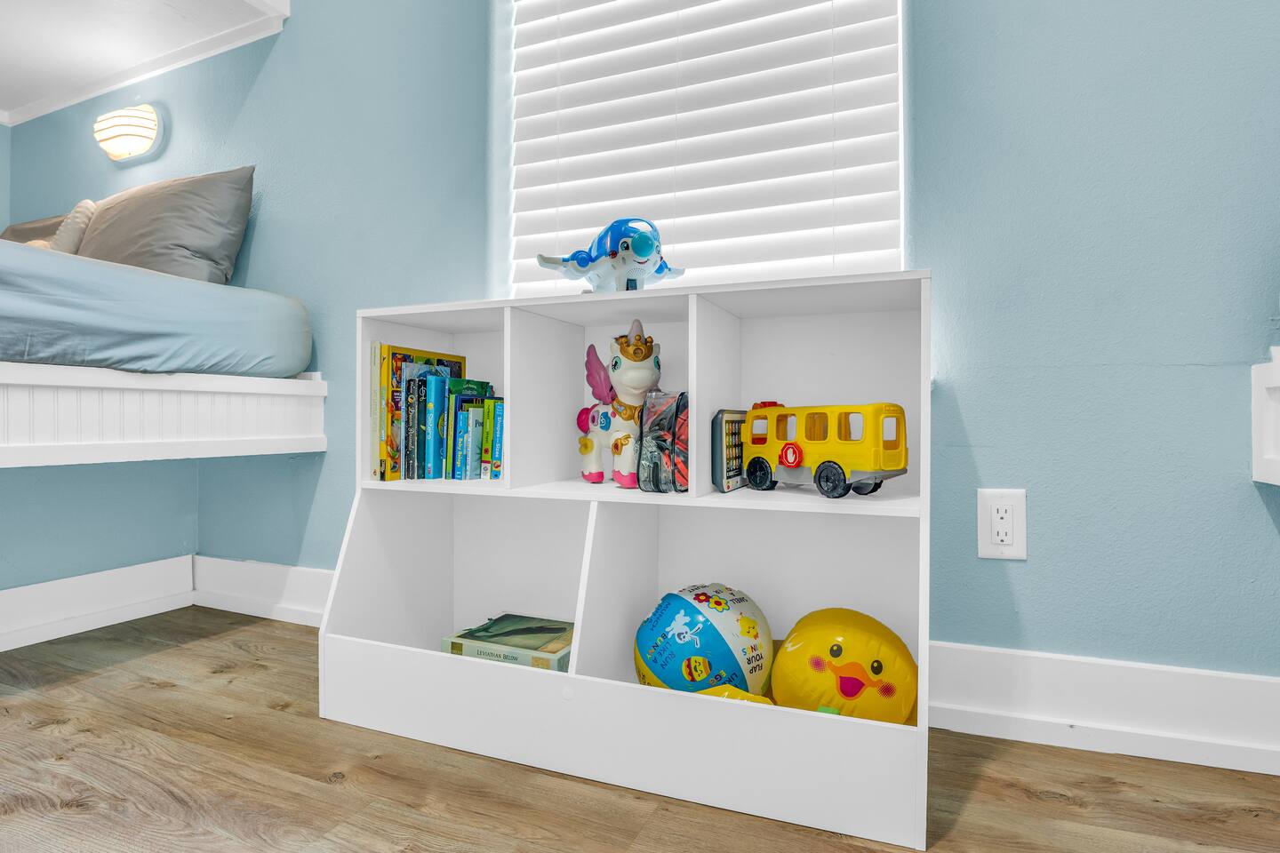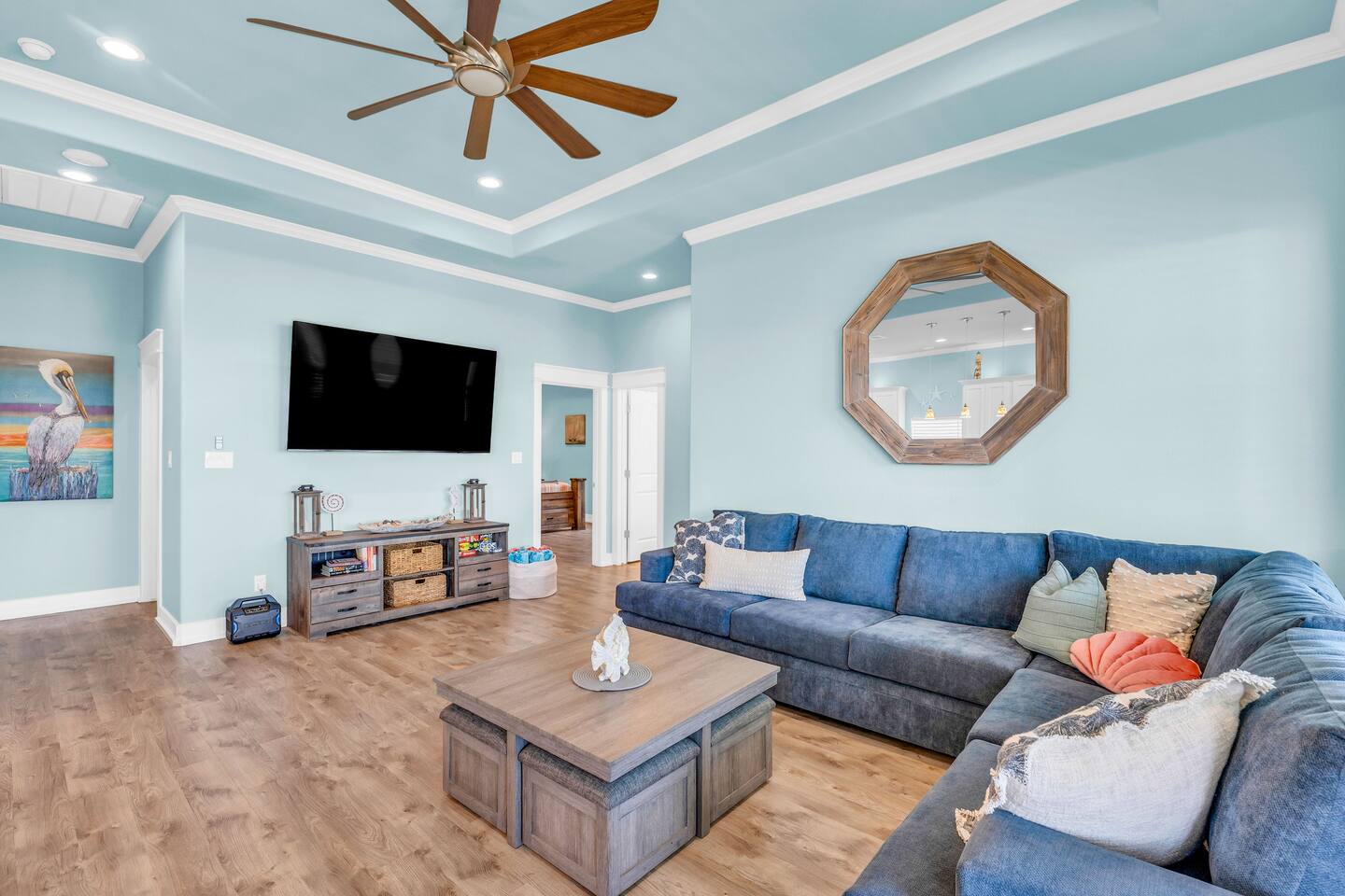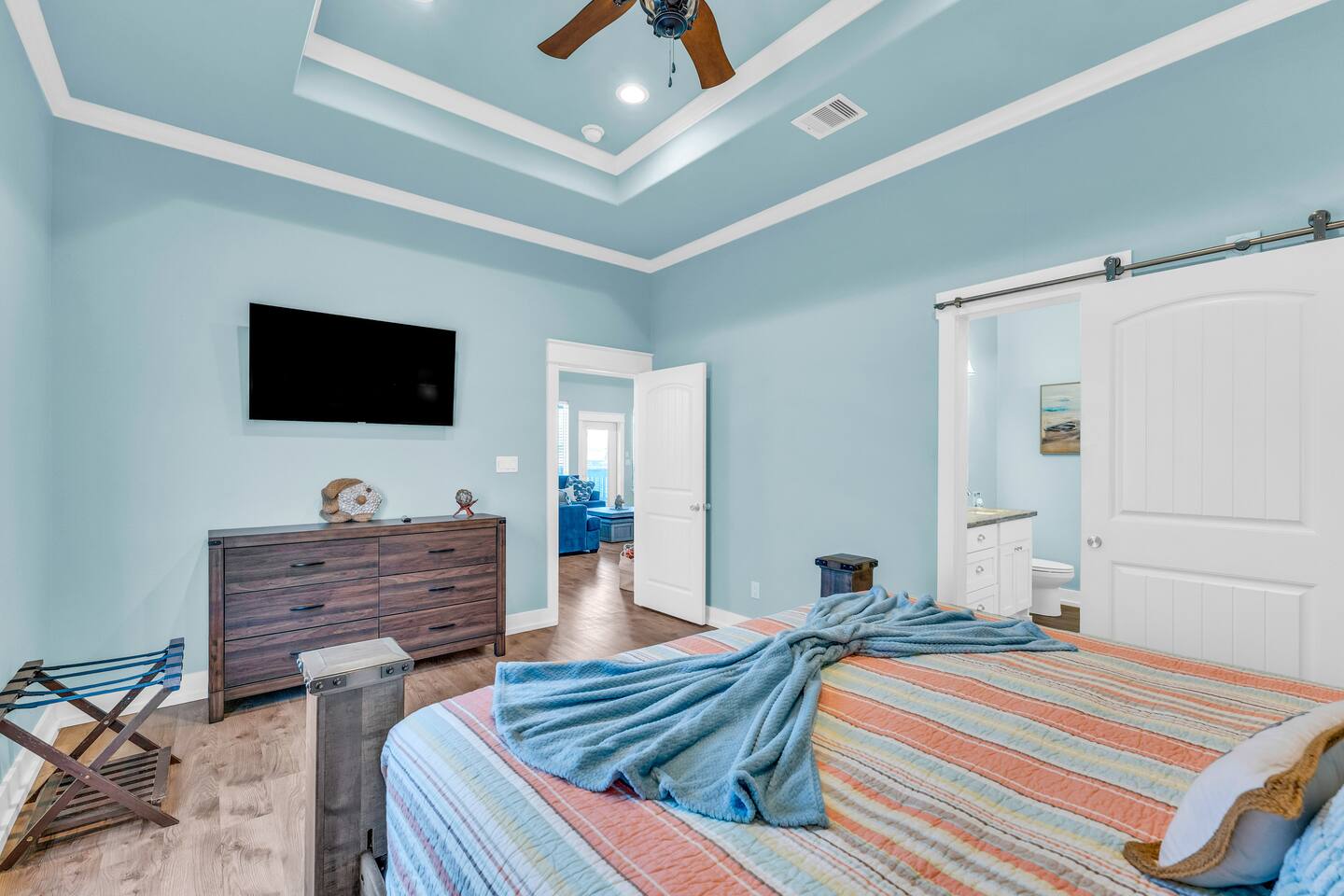 MEET ME ON THE MEZZ – welcome to the Mezzanine at Crystal Beach, where you can enjoy 3 levels of paradise. This family-friendly retreat is the perfect gathering space for your next beach getaway. A 3-minute walk is all that separates you from the sand. You’ll love the Mezzanine level bar, king suite, and kitchen with garage-door access to the outside. The top level welcomes everyone in your party with a family-friendly bunk room, king owner’s suite, and queen bedroom with workstation.
